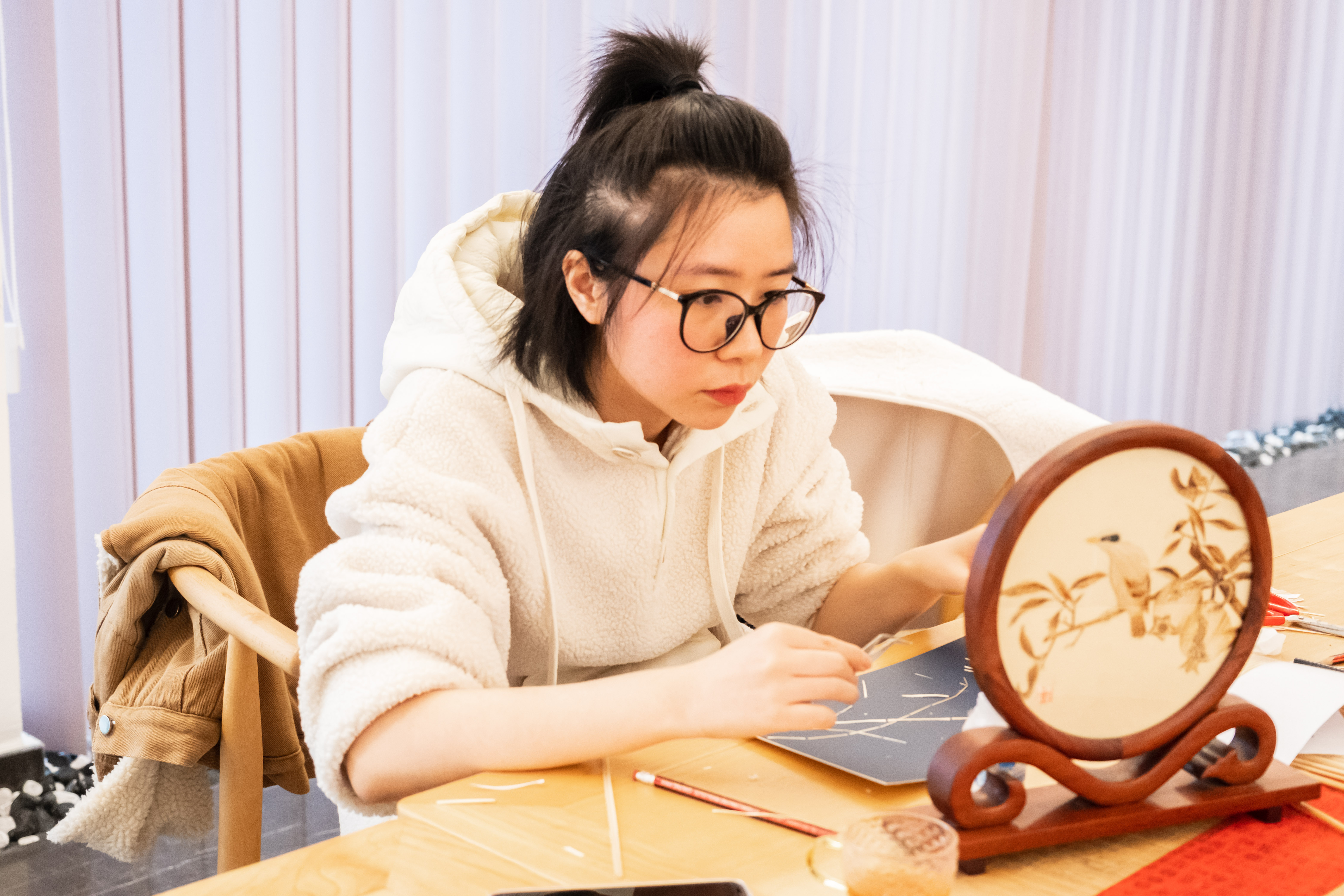 在兰心雅叙 ,有茶饼、编松把、竹根雕鱼拓、船模、鱼灯等各类主题的体验制作 。